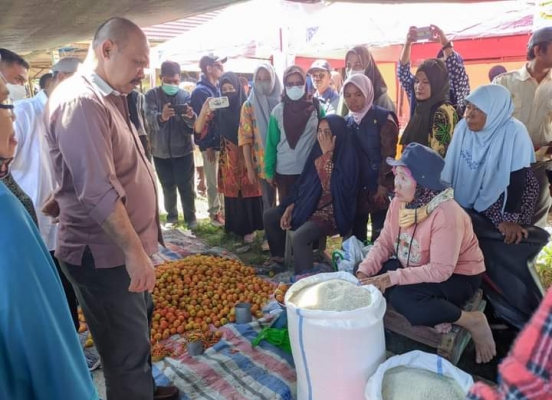 Sekda Nuim Hayat didampingi Kepala Dinas Tanaman Pangan, Hortikultura dan Perkebunan (TPHP) Rahmad Iqbal Nurkhalis, Kepala Perum Bulog Sulteng David Susanto, Kepala Dinas Perdagangan Agus Munandar, dan Kepala Dinas Ketahanan Pangan dan Perikanan Andi Aco Pettalolo, memantau ketersediaan stok pangan dan harga bahan pokok di Pasar Ranggulalo.