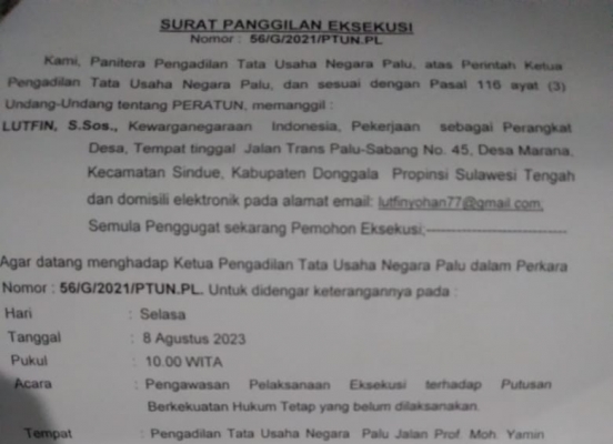 PALU, Sararamedia.net - Ketua Pengadilan Tata Usaha Negara (PTUN) Palu mengirim surat panggilan eksekusi kepada Bupati Donggala dan Kepala Desa Marana, Lutfin, Nomor : 56/G/2021/PTUN/PL pada tanggal 1 Agustus 2023.