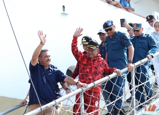 PALU, Sararamedia.net - Setelah menyelesaikan seluruh proses medical check up kesehatan di RS Metropolitan Medical Centre (MMC), Sabtu, 5 Agustus 2023 kemarin, Gubernur Sulawesi Tengah (Sulteng), Rusdy Mastura atau yang akrab disapa Kak' Cudy, tiba di Pelabuhan Pantoloan Palu dengan melambaikan tangan ke masyarakat. Cudy tiba dengan menggunakan modal transportasi laut KM. Lambelu.
