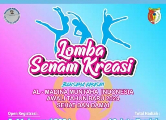 PALU, Sararamedia.net - Mengawali tahun 2024 dengan semangat kebersamaan, Yayasan Almadina Munthaha Indonesia, akan menyelenggaraan Lomba Senam Kreasi dengan tema "Sehat dan Damai."